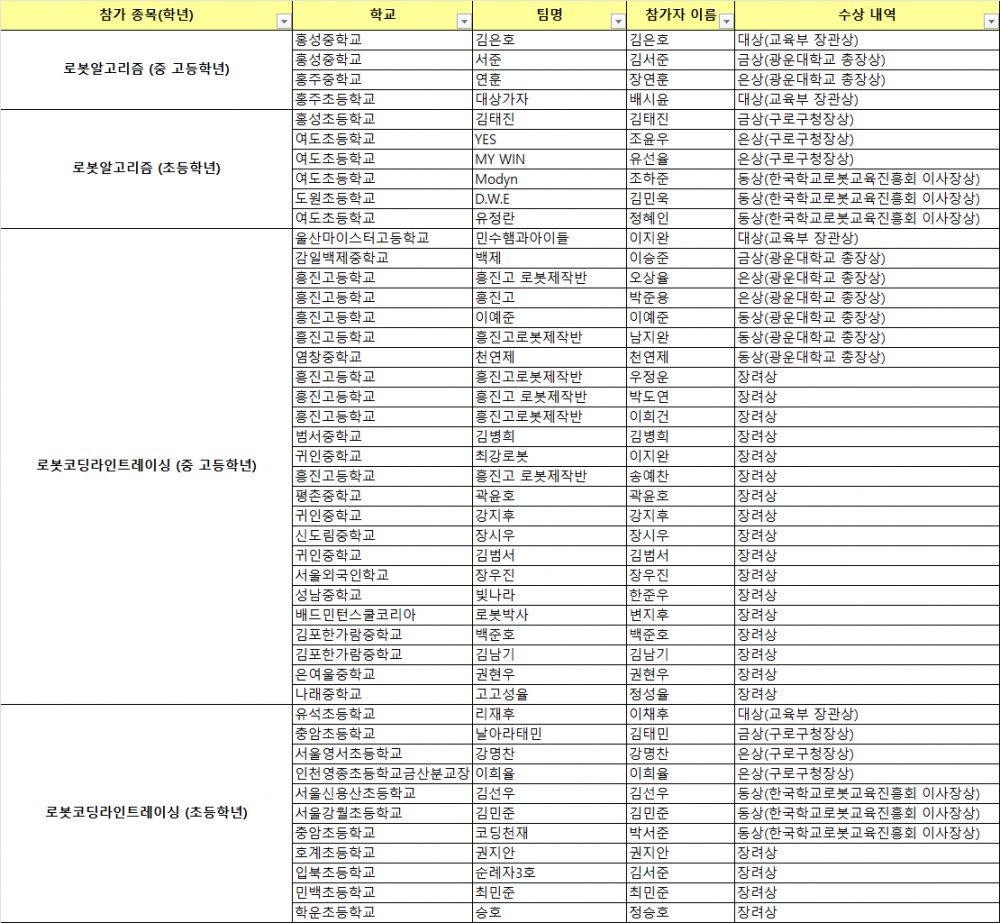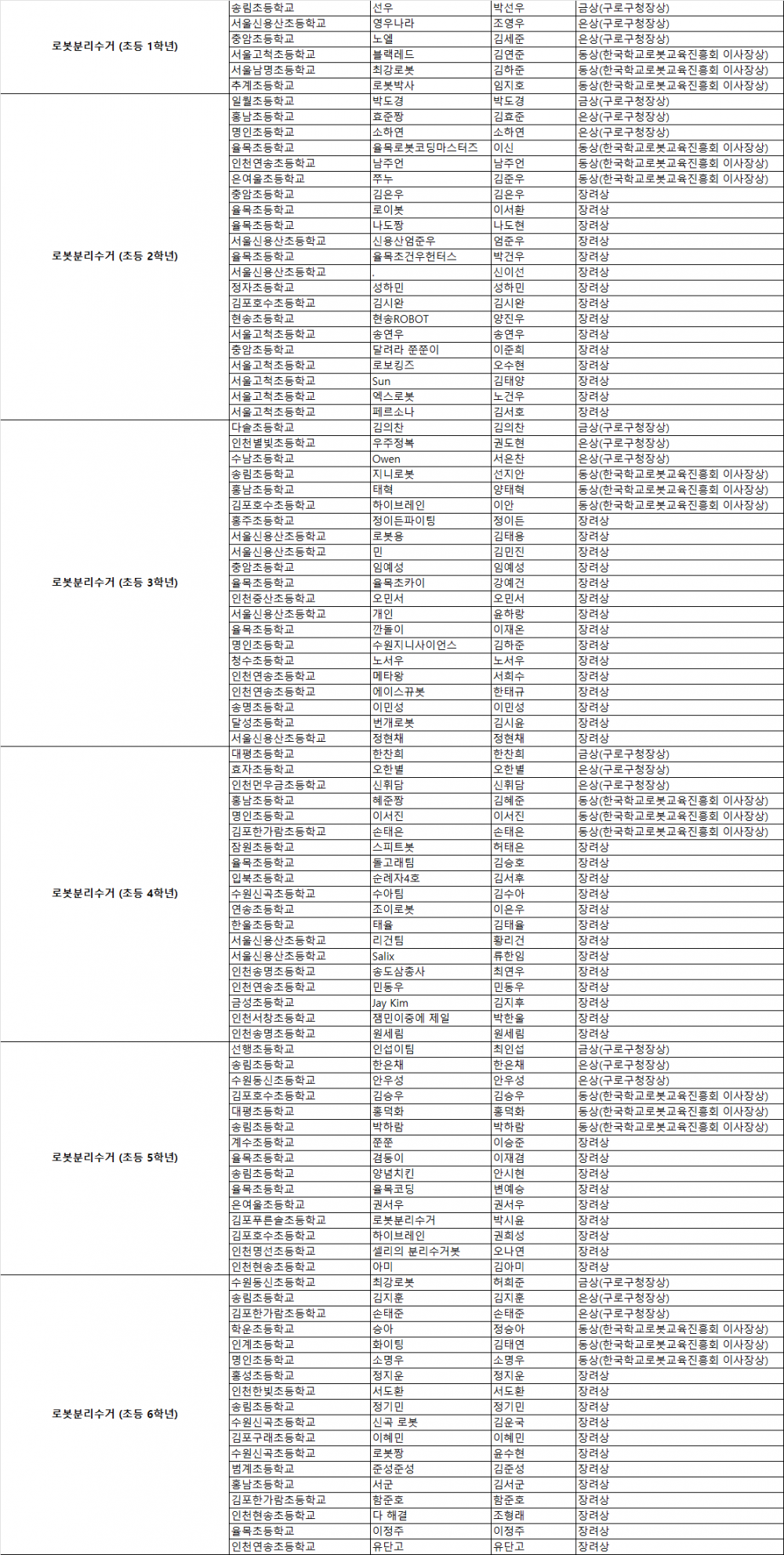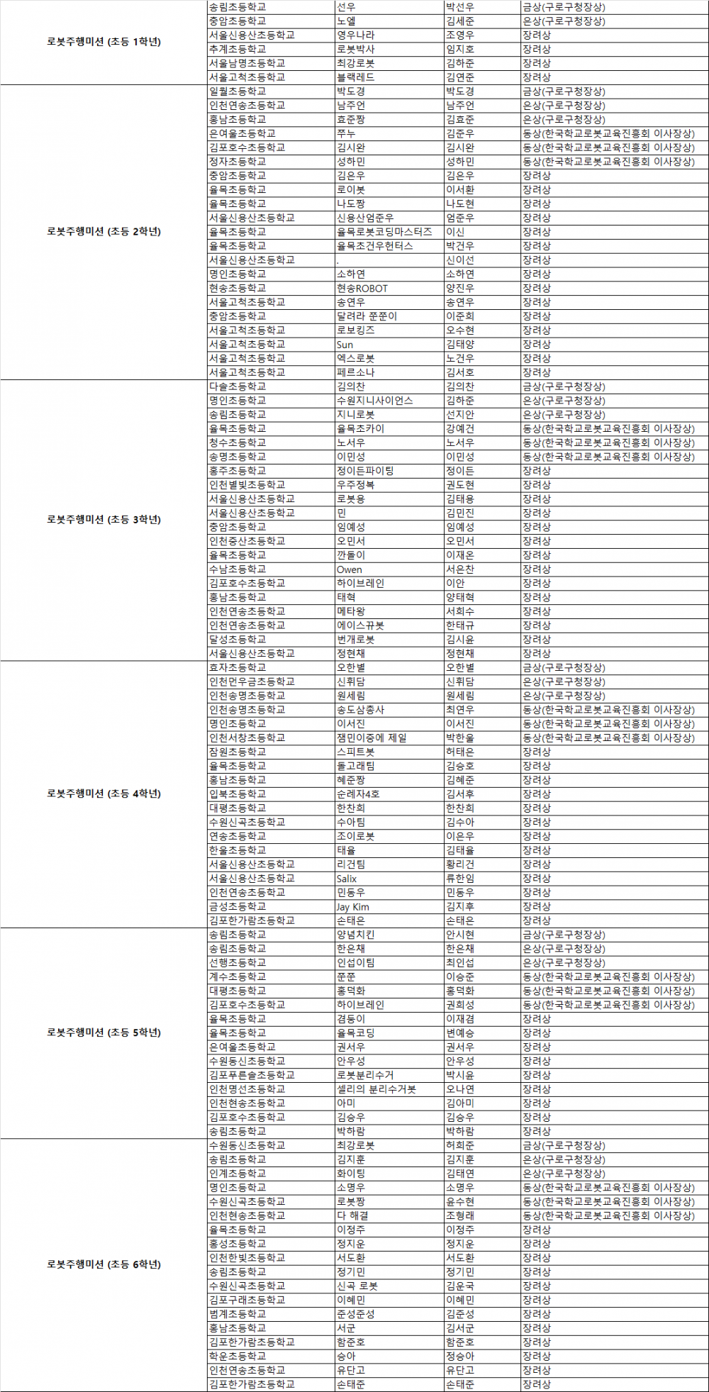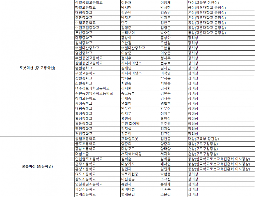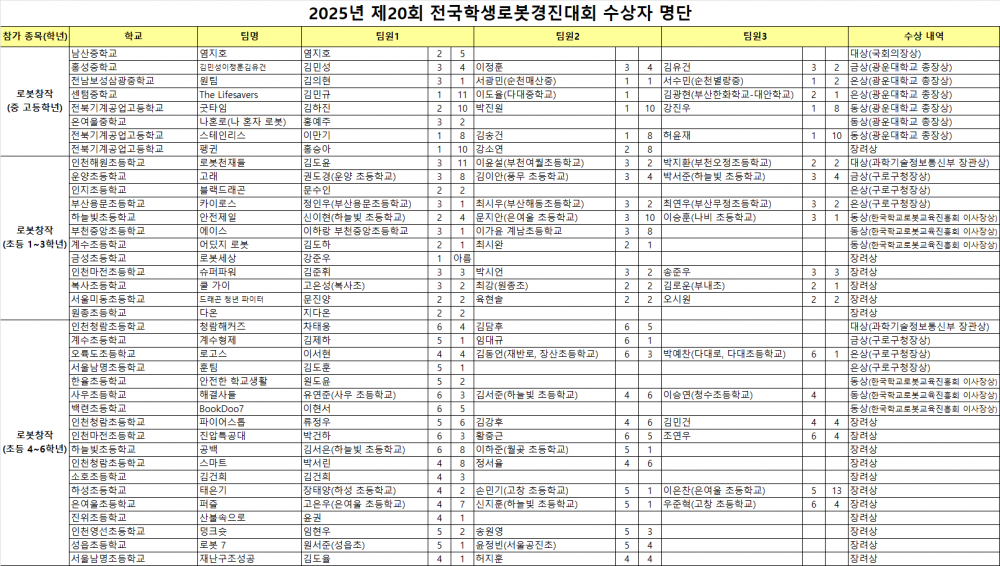 2025년 제20회 전국학생로봇경진대회 수상자 명단 작성자 대회사무국 작성일 2025.10.01 16:31 댓글 0 조회수 1447 . [이 게시물은 대회사무국님에 의해 2025-10-02 09:27:58 [백업] 공지사항에서 이동 됨]